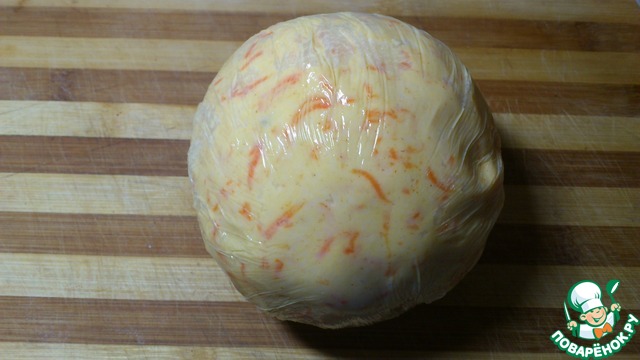 Выложить массу на пищевую пленку, сформировать шар, завязать и отправить в холодильник на 1-2 часа либо в морозильную камеру минут на 30.