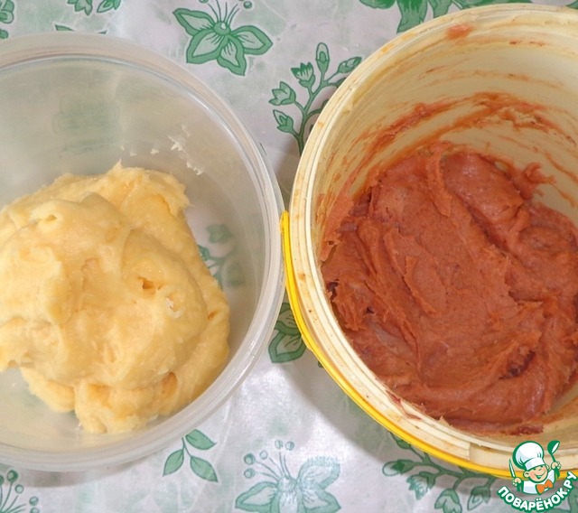 Тесто разделить на две части. В одну часть добавить какао и перемешать.