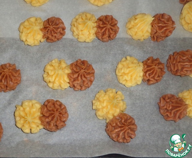 Отсадить на противень профитроли - одна светлая, другая темная (вплотную друг к другу).