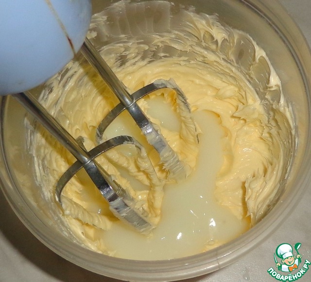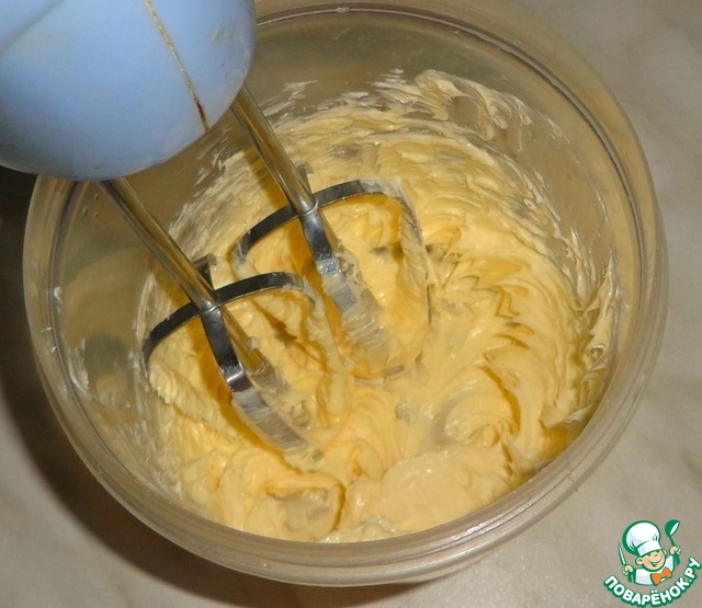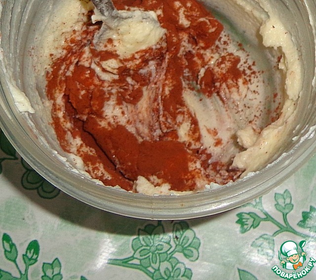 Крем поделить на две части. В одну часть добавить какао и перемешать.