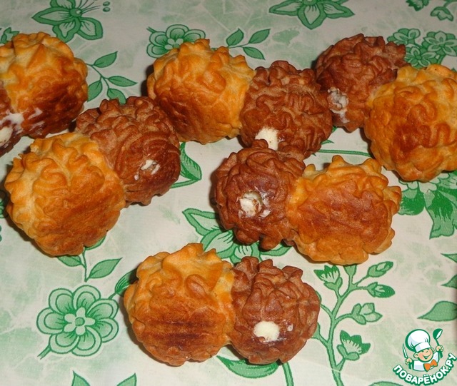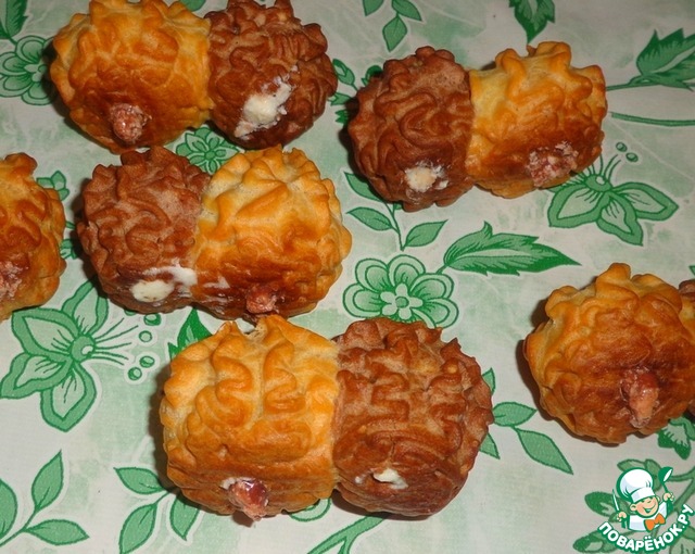 Испечь профитроли. Температура духовки - 180 градусов, выпекать около 45 минут.