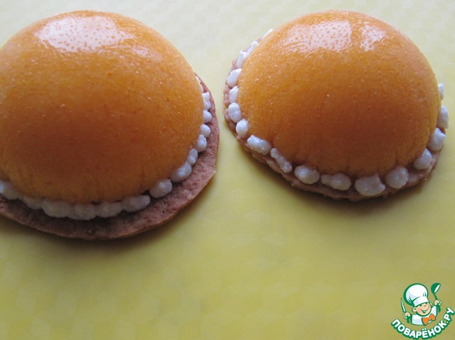Соединить обе смеси, перемешать, слегка охладить и слегка взбить ручным венчиком. Заполнить полусферы полученным кремом и отправить в холодильник до полного охлаждения. При использовании подручного материала - обернуть формы пищевой пленкой! Оптимальный диаметр - 3 см.
