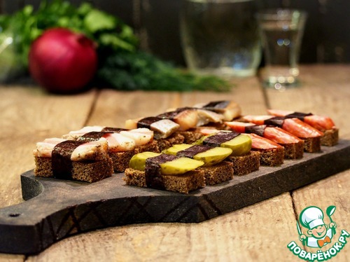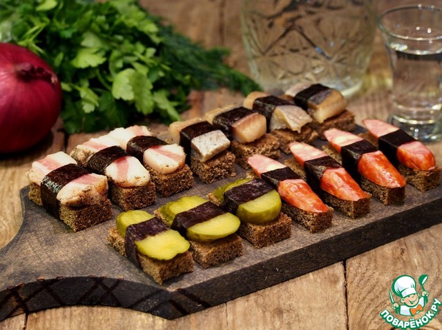 Положить каждый кусочек колбасы, сала... на хлеб и скрепить полоской нори.