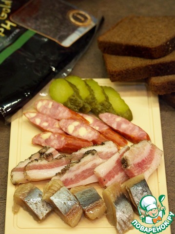 Эту закуску можно приготовить из всего, что хорошо идет под крепкие напитки на ваше усмотрение. Нарежьте огурцы, сало, колбаски и селедку на одинаковые кусочки.
