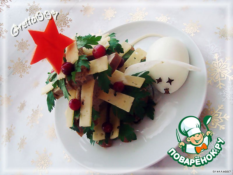 Украшаем елку клюквой. Из сладкого перца вырезаем звезду, прикрепляем на верхушку елки с помощью зубочистки или шпажки.