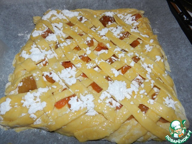 2/3 теста раскатать в прямоугольник толщиной 2-2,5 см. Застелить противень бумагой, смазать маслом, переложить на него тесто. Курагу промыть, обсушить и выложить на тесто. Из оставшегося теста сделать тонкие полосочки и выложить их решёткой сверху. Смазать пирог яйцом, затем посыпать сахарной пудрой. Выпекать в разогретой до 200 градусов духовке 15-20 минут.