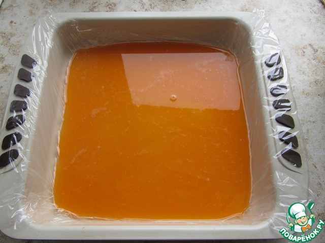 Охлажденную заготовку обернуть вырезанной по размеру полоской желейной оболочки, сверху накрыть желейным диском.