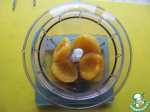Очищенные консервированные персики измельчить блендером до пюре образного состояния, влить сироп из банки, перемешать.