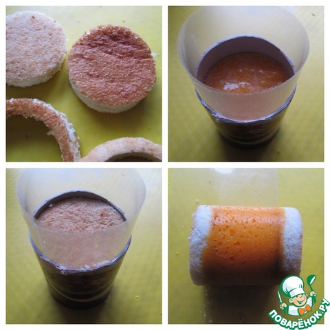 Из готового бисквита вырезать тонкие круглые заготовки по диаметру формы, в которой будет собираться десерт. Форму застелить внутри плотным файлом, на дно выложить бисквит, по желанию его можно пропитать кальвадосом, затем выложить слой персикового пюре, накрыть вторым бисквитом.