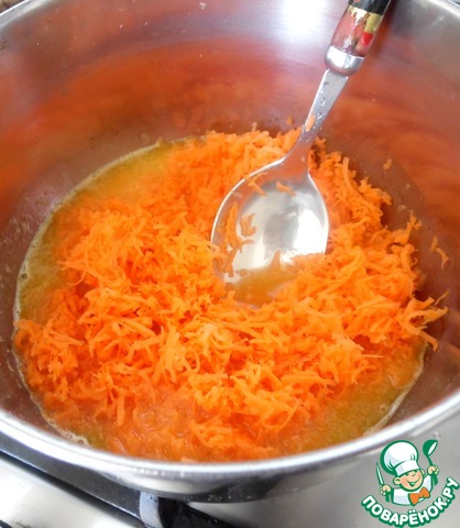 Начнём с приготовления джема. Джем морковно-мандариновый. Яркий, солнечный, ароматный, вкусный джем из морковки и мандарина, с насыщенным цитрусовым вкусом. Советую всем его приготовить. Морковь очищаем и натираем на мелкой терке. Морковь выкладываем в кастрюлю, добавляем сахар, мандариновый сок, воду. Ставим кастрюлю на медленный огонь и варим полчаса.