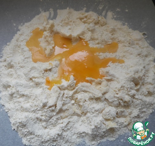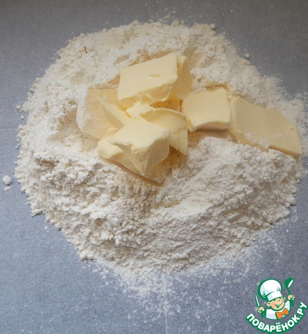 Высыпаем муку на доску, добавляем сливочного масла и рубим масло с мукой ножом, перемешиваем,