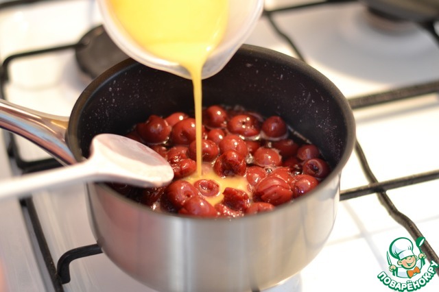 Крахмал размешать в аппельсиновом соке и струйкой влить в вишни.