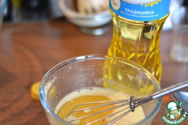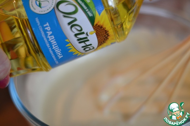 Яйца взбить, добавить подсолнечное масло "Олейна", сахар и кефир.