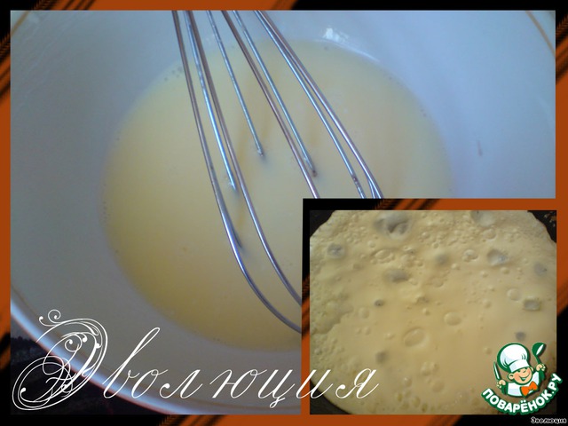 2 яйца и 50мл молока взбиваем венчиком, солим. Выливаем на раскаленную сковородку и накрываем крышкой. В итоге у нас – нежнейший пышный омлетик, похожий на лунную поверхность:-) Перекладываем его на тарелку