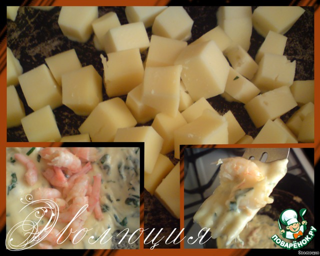 Сыр на сковороде расплавляем, сыпем в него зелень, давим чесночок, сбрызгиваем лимонным соком и выливаем бульончик. Все размешиваем до однородности и добавляем креветки. Немного томим и снимаем с огня.
