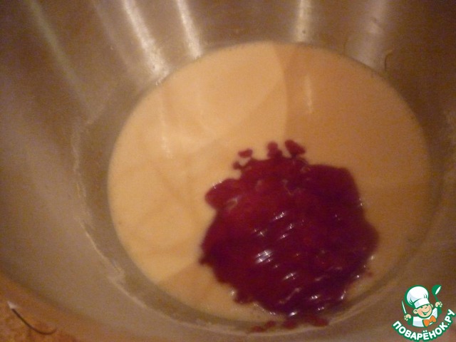 БОльшую часть малины взбить блендером и перетереть через сито (впрочем, если Вам малиновые косточки не напрягают, то можно не перетирать) и добавить к тесту.