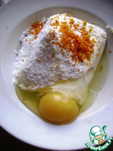 Для начинки творог растереть с цедрой и сахарной пудрой, добавить яйцо и крахмал и хорошо перемешать.