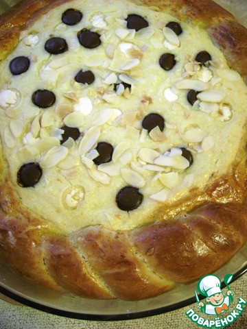 С подошедшего теста снять кастрюлю, выложить в углубление начинку, разложить сверху шоколадные капли и посыпать миндальными лепестками.