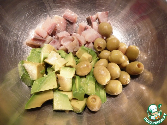 Селедку и авокадо нарезать кубиками, из оливок слить жидкость. Подготовленные продукты измельчить блендером.