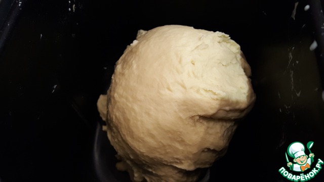 Замесить тесто. Я пользуюсь моей доброй помощницей хлебопечкой. Я определяю состоятельность теста по двум параметрам. Первое при замесе должен образоваться колобок, не жидкий, но и легко прокручивающийся в х/п. И после замеса тесто должно подняться до края ведёрка. Если муки менее 700 г, то немного ниже.