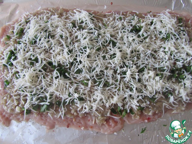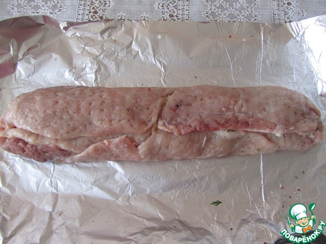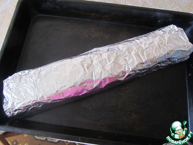 Завернуть рулет в фольгу и запекать в духовом шкафу при температуре 180 градусов в течении 80 минут.