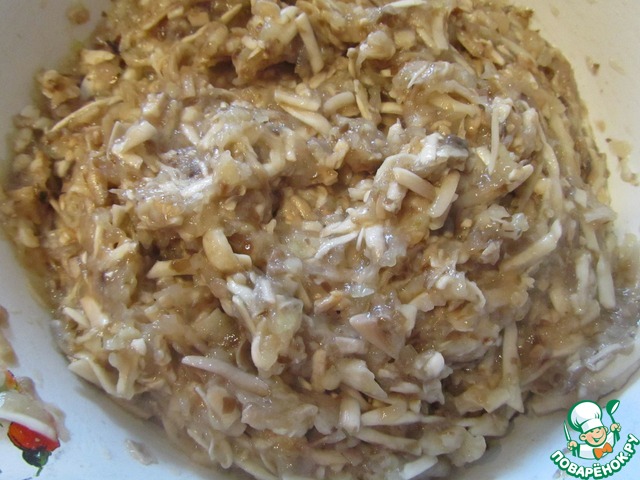 Через мясорубку пропустить куриные грудки с луком. Затем натереть на крупной терке шампиньоны и добавить в куриный фарш. Посолить и все хорошо перемешать.