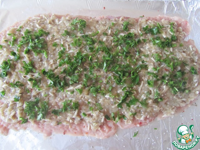 Затем по мясу ровным слоем распределить куриный фарш с грибами и посыпать сверху рубленой зеленью.