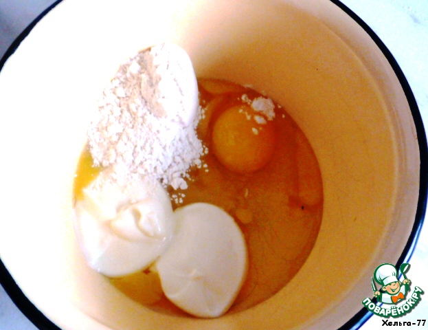 Смешиваем яйца, муку, майонез. Добавляем 1 чайную ложку острого кетчупа.