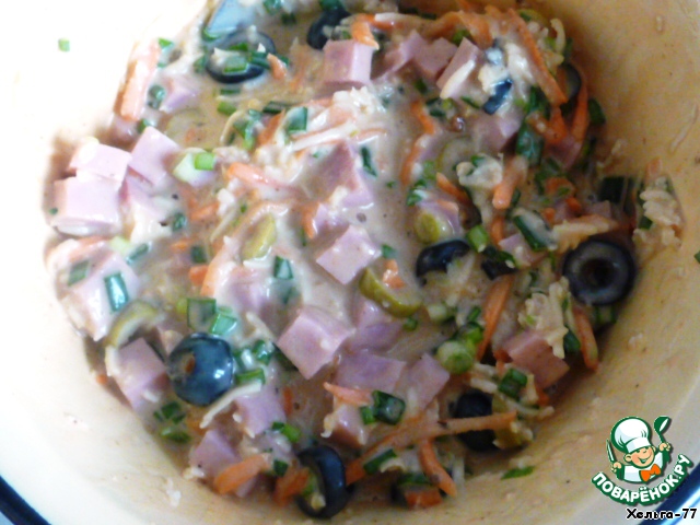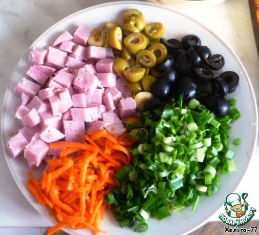 Нарезаем ветчину, оливки, маслины, зелень. Иногда я добавляю обжаренные шампиньоны, мелко нарезанные соленые огурчики (как фантазия подскажет). В этот раз я использовала морковь по - корейски.