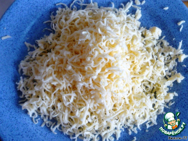 Натираем на мелкой терке сыр. Часть сыра откладываем и смешиваем с натертым на мелкой терке чесноком (можно воспользоваться "давилкой" для чеснока)