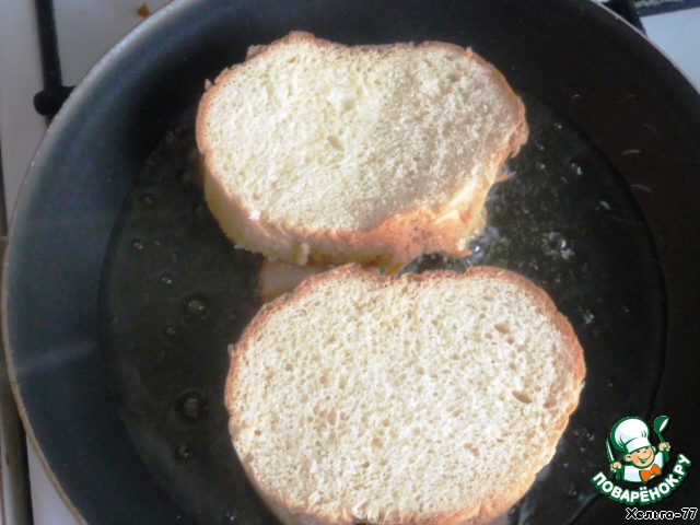 Обжариваем на заранее разогретой сковороде с растительным маслом. Внимание! Сначала со стороны начинки, а затем, аккуратно переворачивая, чтобы не повредить сырную корочку, на другой.