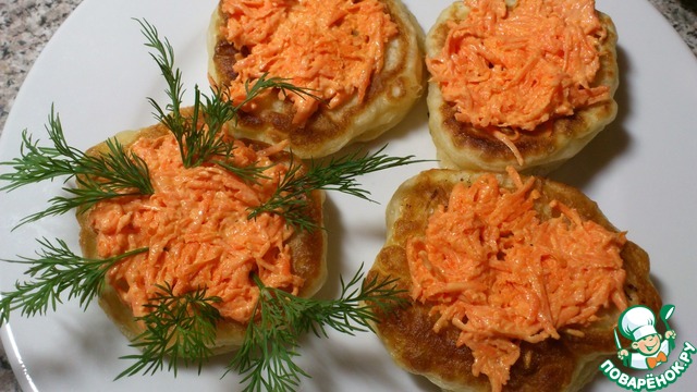 Распределить на оладьи по 1 чайной ложке морковной начинки, по кругу вставить веточки укропа.