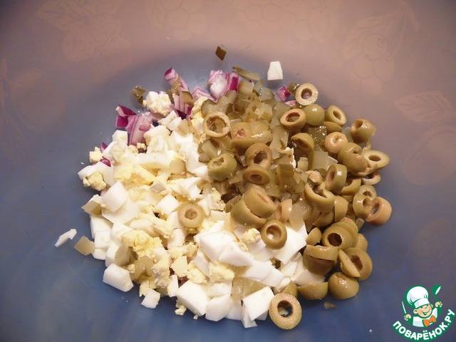 Яйца и лук нашинковать, оливки нарезать небольшими кубиками, огурцы - небольшими кубиками.