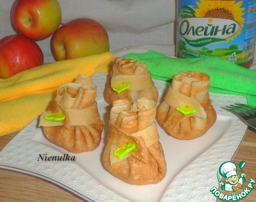 Сформировать мешочек, обвязать его блинной полоской и зафиксировать палочкой для канапе.