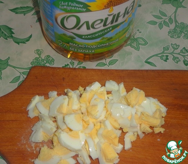 Приготовим начинку для блинных мешочков. Порезать крупно отварные яйца.