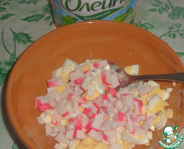 Порезать крабовые палочки и добавить к яйцам. Перемешать.