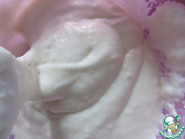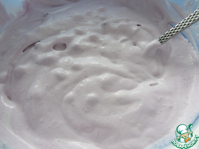 Пока наш бисквит остывает мы приготовим крем. Взбиваем крем с сахарной пудрой. Небольшую часть крема отложить для обмазки, а в другую часть добавляем чернику и хорошо перемешиваем.