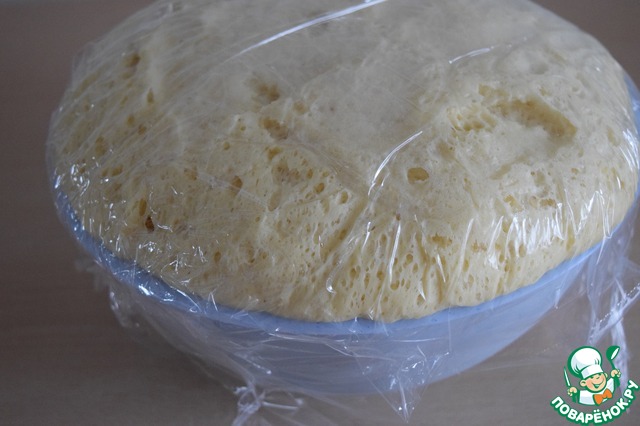 Накрываем тесто плёнкой и ставим в тёплое место на 1,5 часа для подъёма.