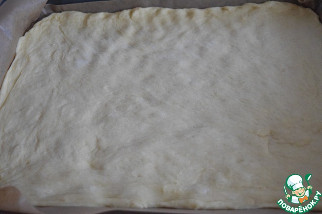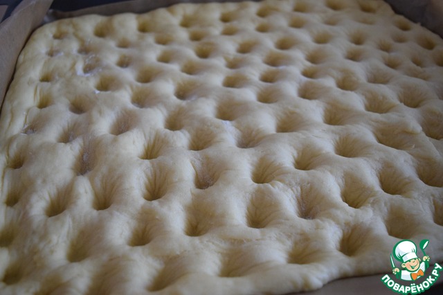 Тесто не вымешиваем, не обминаем, а сразу распределяем по противню руками, смоченными в муке. Оставляем ещё раз на 30 минут в тёплом месте для подъёма.