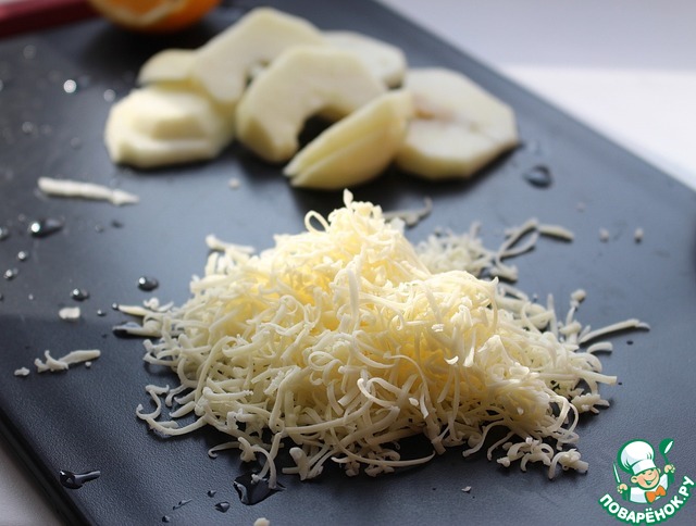 Яблоко очистить от кожуры и сердцевины и нарезать тонкими дольками. Сыр натереть на мелкой терке.