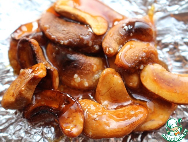 Для карамелизации орехов: В кастрюльке нагреть сахар до состояния светлой карамели, добавить 20 г обжаренных орехов и тщательно перемешать. Выложить на смазанную маслом фольгу или пергамент, дать остыть.