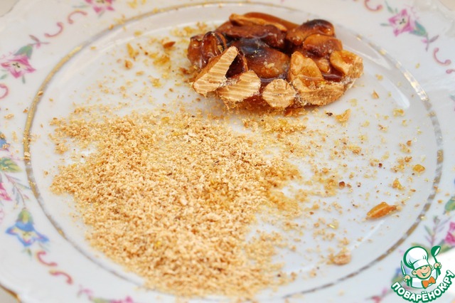 Остывшие карамелизированные орехи натереть на мелкой терке.