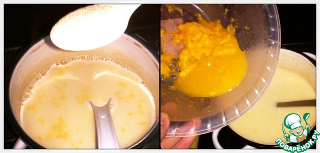 Когда крем начнет густеть, добавляем сок из апельсина. Сок я не процеживаю, т. к в рецепте это не принципиально. Готовим крем на медленном огне, помешивая.