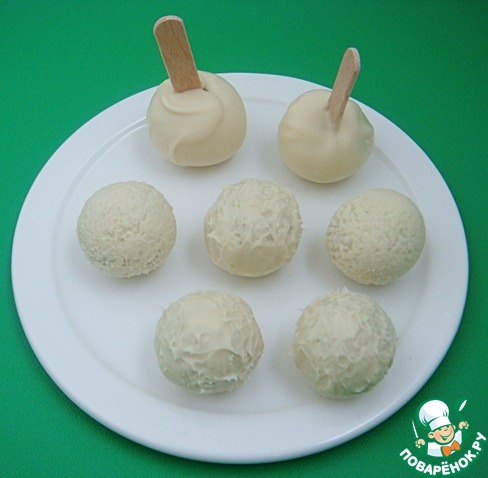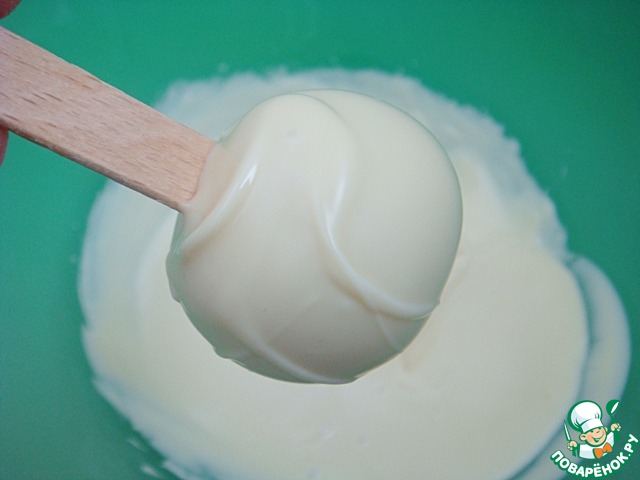 Можно, работая в перчатках, положить на ладонь чайную ложку глазури и обвалять в ней замороженную заготовку, прикасаясь к поверхности пальцами и быстро убирала их. Глазурь застывает моментально, образуются интересные неровности.