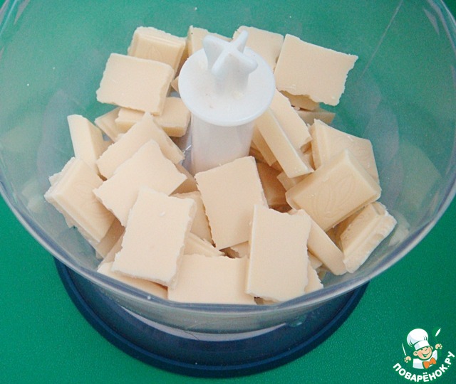 Для глазури измельчить 150 г. белого шоколада удобным для вас способом, перемешать с 1 ст. л. растительного масла.