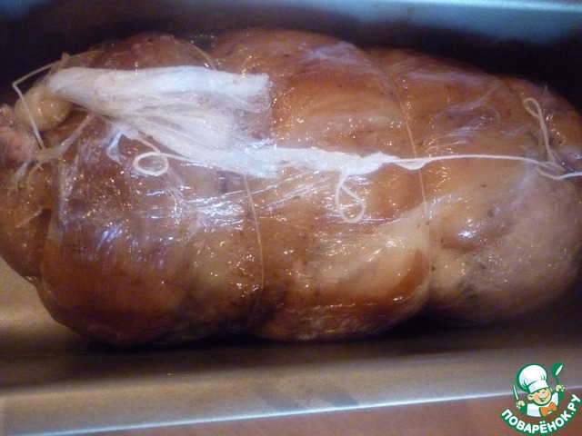 Сформировать рулет и плотно обернут этой же плёнкой и зафиксировать ниткой.