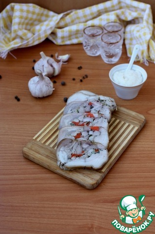 Разрезать рульку вдоль и, сохраняя шкуру, вынуть кости и бОльшую часть мяса. Расстелить пищевую плёнку, разложить шкуру и мясо поверх неё. Посыпать зеленью и измельчённым чесноком. Нарезать брусочками отварную морковь и выложить её сверху.