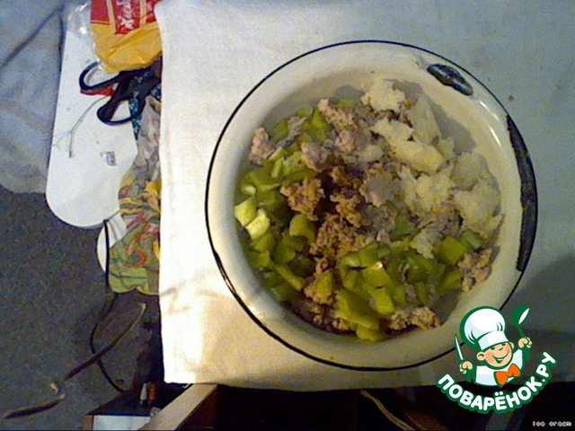 Все тщательно перемешиваем, добавляем 4-5 столовых ложек бульона. Солим, перчим, добавляем мускатный орех. В оригинальном рецепте начинка приправлялась лимонным соком и я решилась на эксперимент - добавила к своей начинке немного молотой апельсиновой цедры (в готовом блюде не ощущается, но и не портит)