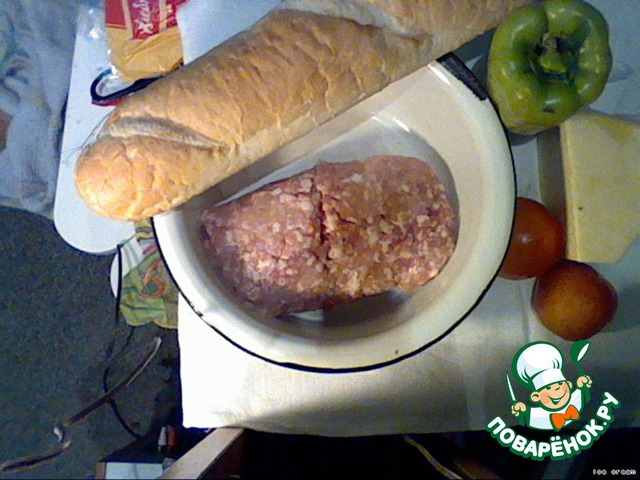Обжариваем фарш, постоянно помешивая, чтобы он получился рассыпчатым. Багет режем вдоль на две части и выгребаем оттуда мякиш (аккуратней, у него довольно тонкая корочка, которую можно порвать в процессе). Режем болгарский перец и помидор. Делаем начинку для багета: смешиваем в миске мякиш багета, обжаренный фарш, помидор и перец, добавляем молотые орехи