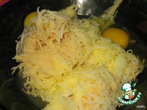 Смешать картофель, лук, яйца, сыр, соль и перец.